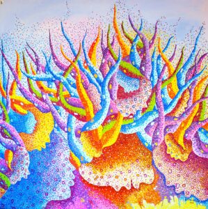 Usant du pointillisme, un mouvement artistique et pictural opérant par « petites touches, utilisant de petites zones de couleurs juxtaposées plutôt que des mélanges de pâtes colorées pures, mouvement qui a succédé à l’impressionnisme et où se sont illustrés de grands noms comme Georges Seurat, Vincent van Gogh ou encore Paul Signac, l’artiste nous amène à comprendre l’adversité. Celle-ci s’exprime au travers des formes aux contours bien colorés. On peut remarquer des têtes de personnes hors du commun sur lesquelles sont hissés d’autres têtes plus petites encore. Tout comme « Idée obscure » ou « Pense à toi » ou encore « Gomido » (titre des œuvres). Toute l’œuvre de l’artiste incite au surpassement, à arrêter de ressembler à l’autre de qui on est différent. Nous devons personnellement donc, nous lancer le défi d’aller au bout de nos peurs en transformant les voix dans nos têtes qui nous découragent, nos pensées obscures en forces afin d’être vainqueurs dans tout ce que nous faisons. Nous sommes aussi appelés par ces œuvres à développer le vivre-ensemble, la solidarité et l’unité.