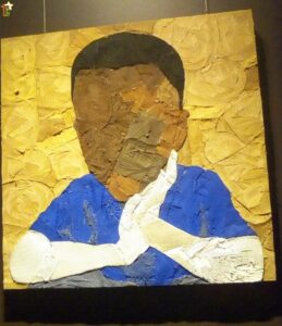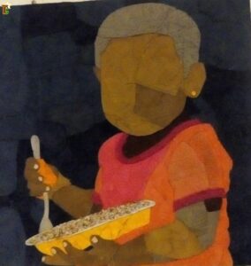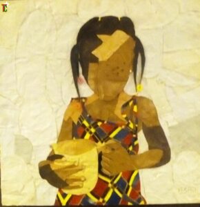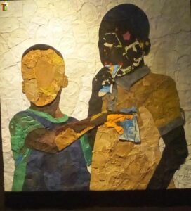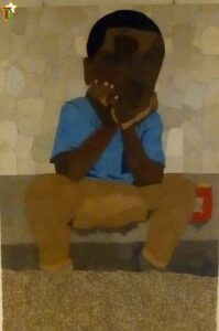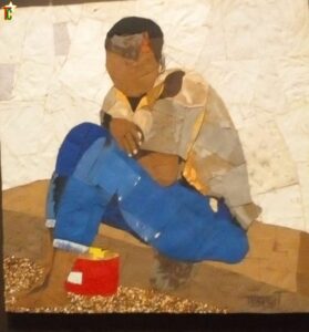 L’artiste a été très méticuleux dans le découpage et l’assemblage des sandalettes de sorte à faire remarquer les habits, les culottes, les cheveux coupés ou tressés avec ou sans chouchous, les bracelets au poignet, les boucles d’oreilles, les nourritures, les fruits que doivent vendre les enfants pour pouvoir se nourrir. Tout cela traduit si bien le vécu de ces enfants-là qui se confient à nous à travers ces tableaux. On est à la fois émerveillé devant autant de talent et on a la chair de poule devant l’expression des toiles, le message véhiculé par l’auteur à travers elles. Comme il l’a dit lui-même : « j’espère que mes enfants vont vous parler et vous convaincre de les adopter ». Que d’émotion ! On en a même des larmes aux yeux. Etre artiste peintre c’est surtout donner de l’émotion à travers un tableau et aller au-delà du beau. C’est justement ce qu’a su faire Tesprit Tété.